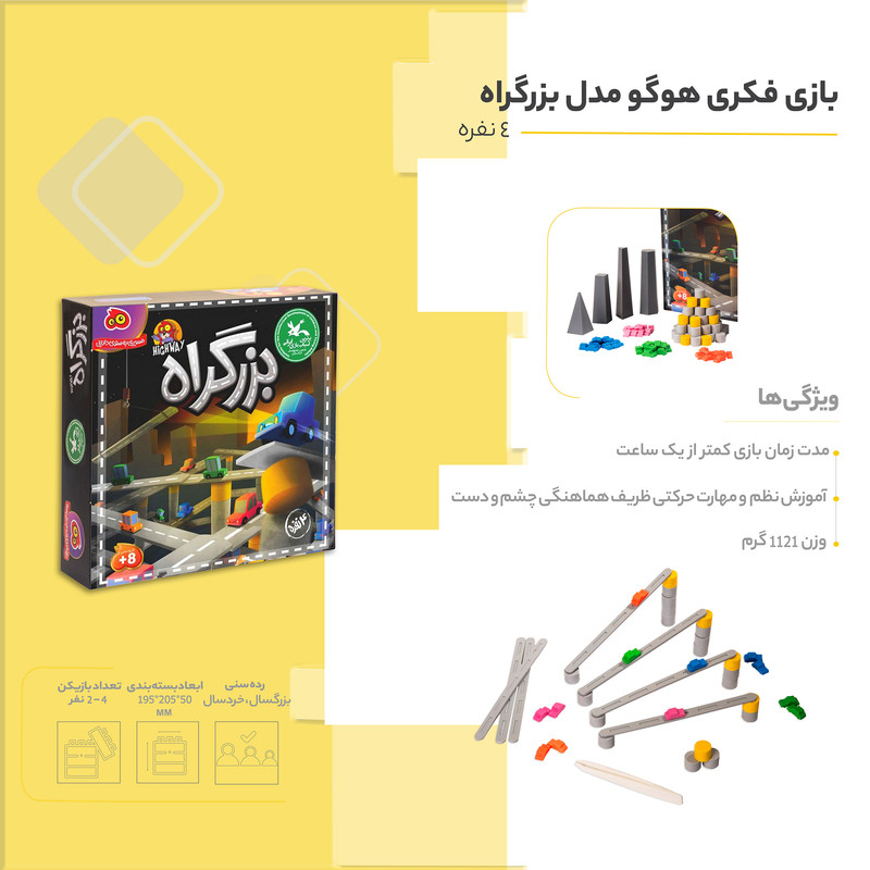 این تجربه ی جذاب و پر از هیجان را می توانید از فروشگاه بازی فکری بازبازی تهیه کنید و لحظاتی پر از تمرکز و رقابت سالم را برای خود و دوستانتان رقم بزنید. وقتی جعبه بازی فکری بزرگراه را باز می کنید، با 4 ساختمان، 1 انبر، 40 ماشین در 4 رنگ، 80 ستون خاکستری و 8 ستون زرد، و 36 قطعه جاده روبرو می شوید که هر کدام نقشی کلیدی در ساخت بزرگراه شما دارند.