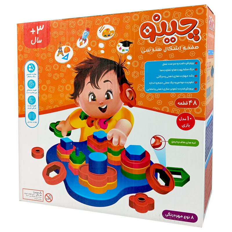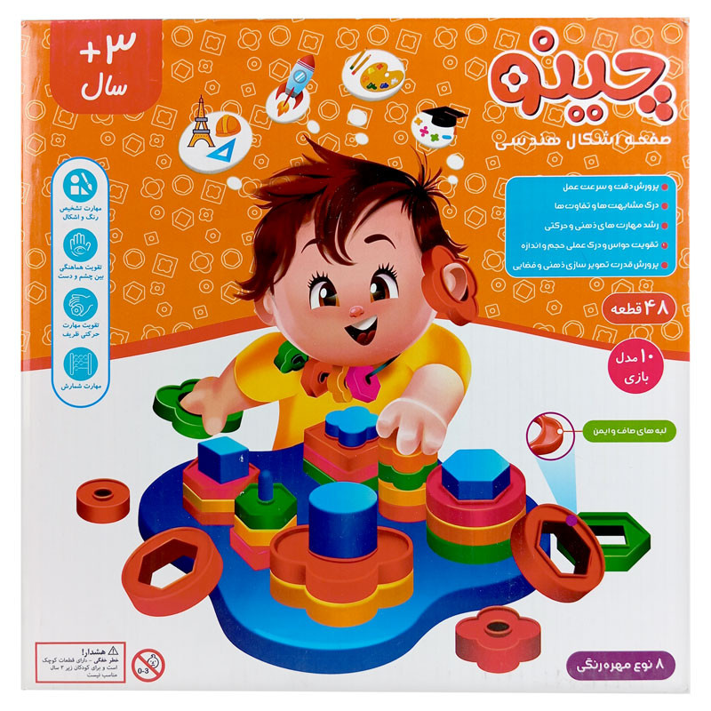 بازی چینو CHiNO – طرح اشکال هندسی یک وسیله آموزشی است. مزایای این بازی عبارتند از: پرورش دقت و سرعت عمل کودک – درک مشابهت ها و تفاوتها – رشد مهارت های ذهنی و حرکتی – تقویت حواس و درک عملی حجم و اندازه – پرورش قدرت تصویر سازی ذهنی و فضایی. این بازی شامل یک صفحه پایه است که شش پایه بر روی آن نصب می گردد و پس از آن کودک میبایست اشکال مختلف را با دقت انتخاب و تشخیص دهد هر شکل بر روی کدام پایه میتواند قرار گیرد.